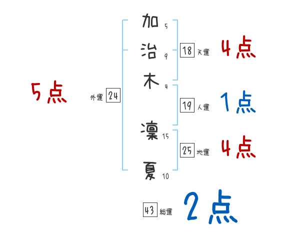 総運![]() | 加治木凜夏さんの総運は43画の2つ星!頑固な性格で独立心が強いかも。やや非現実的で浪費に注意しましょう。 あなたの人生を表す1番重要な運勢です。生涯を通じて影響する総合運となり、主に50歳以降の晩年期に影響を及ぼします。 |