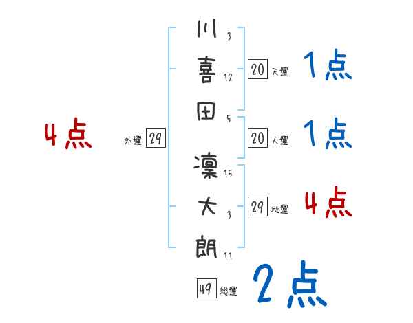 地運![]() | 川喜田凜大朗さんの地運は29画の4つ星!完全主義で才能がある。厳格な心の持ち主。 個性を表す基礎的な運勢です。性格形成や対人関係、行動力など家庭環境に影響されます。主に誕生してから20歳くらいまでの若年期の運勢を表します。 |