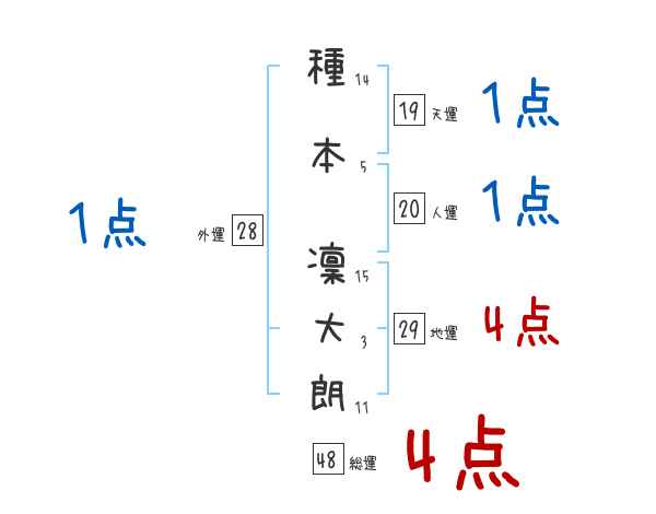 天運![]() | 種本凜大朗さんの天運は19画の1つ星!優れた才能を持ちますが、協調性が足りないことも。周りの人と協力する事を意識しましょう。 家系が持つ宿命的な運勢を表します。祖先から受け継いだ苗字ですので自分の力が及びません。家柄を象徴します。 |