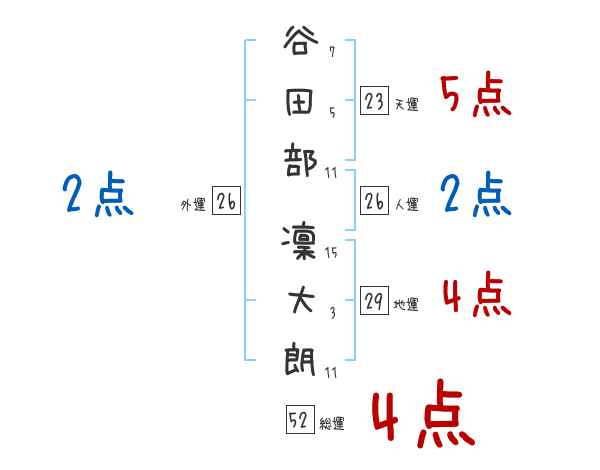 天運![]() | 谷田部凜大朗さんの天運は23画の5つ星!想像力に優れ活力がある。一代で成功し名誉を手に入れる。 家系が持つ宿命的な運勢を表します。祖先から受け継いだ苗字ですので自分の力が及びません。家柄を象徴します。 |