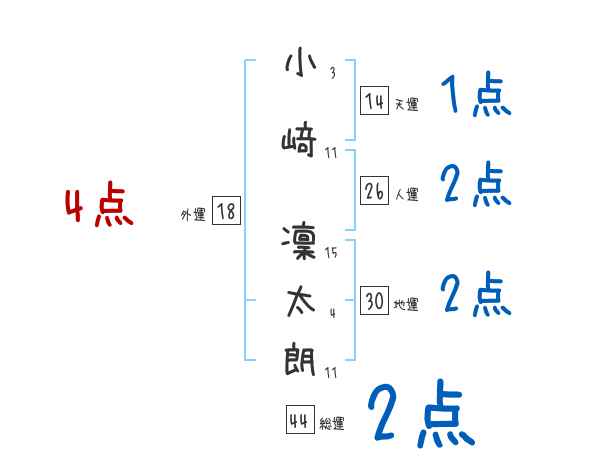 総運![]() | 小﨑凜太朗さんの総運は44画の2つ星!誠実で慎重な性格。物事を考えすぎないように注意しましょう。 あなたの人生を表す1番重要な運勢です。生涯を通じて影響する総合運となり、主に50歳以降の晩年期に影響を及ぼします。 |