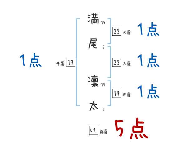 外運![]() | 満尾凜太さんの外運は19画の1つ星!優れた才能を持ちますが、協調性が足りないことも。周りの人と協力する事を意識しましょう。 生活面を象徴する運勢です。外部から受ける影響力を表し、結婚運、家庭運や職場、環境への順応性を表します。 |