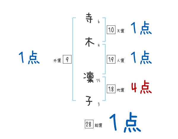 天運![]() | 寺木凜子さんの天運は10画の1つ星!不安を感じやすい傾向。ストレスを抱えないように注意しましょう。 家系が持つ宿命的な運勢を表します。祖先から受け継いだ苗字ですので自分の力が及びません。家柄を象徴します。 |