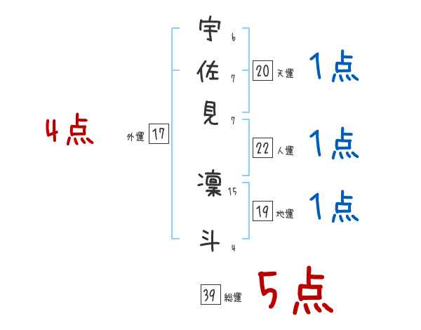 総運![]() | 宇佐見凜斗さんの総運は39画の5つ星!社交性に優れ人望が厚い。人の上に立ち成功する。 あなたの人生を表す1番重要な運勢です。生涯を通じて影響する総合運となり、主に50歳以降の晩年期に影響を及ぼします。 |