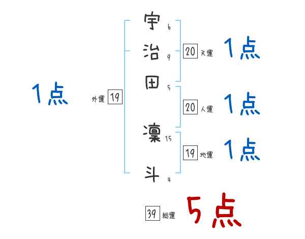 総運![]() | 宇治田凜斗さんの総運は39画の5つ星!社交性に優れ人望が厚い。人の上に立ち成功する。 あなたの人生を表す1番重要な運勢です。生涯を通じて影響する総合運となり、主に50歳以降の晩年期に影響を及ぼします。 |