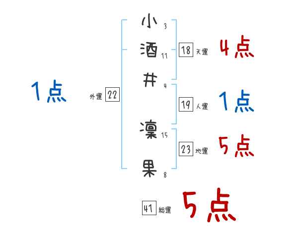 天運![]() | 小酒井凜果さんの天運は18画の4つ星!情熱的で剛気。忍耐力があり信頼される。 家系が持つ宿命的な運勢を表します。祖先から受け継いだ苗字ですので自分の力が及びません。家柄を象徴します。 |