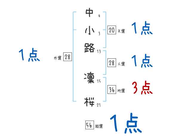 総運![]() | 中小路凜桜さんの総運は56画の1つ星!消極的で無気力になりがち。誠実な気持ちが必要でしょう。 あなたの人生を表す1番重要な運勢です。生涯を通じて影響する総合運となり、主に50歳以降の晩年期に影響を及ぼします。 |