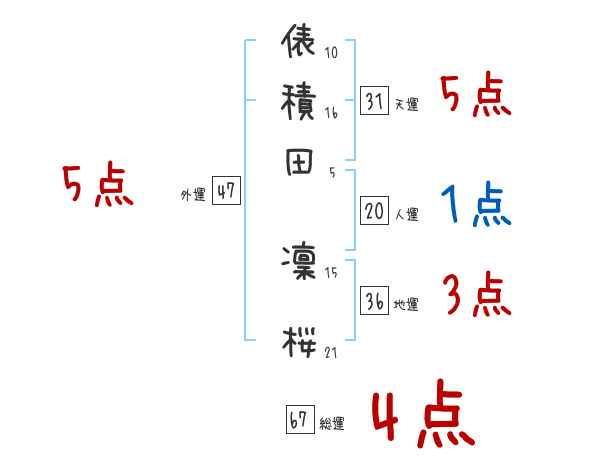 外運![]() | 俵積田凜桜さんの外運は47画の5つ星!実力が開花し発展する円満な人生。財に恵まれる。 生活面を象徴する運勢です。外部から受ける影響力を表し、結婚運、家庭運や職場、環境への順応性を表します。 |