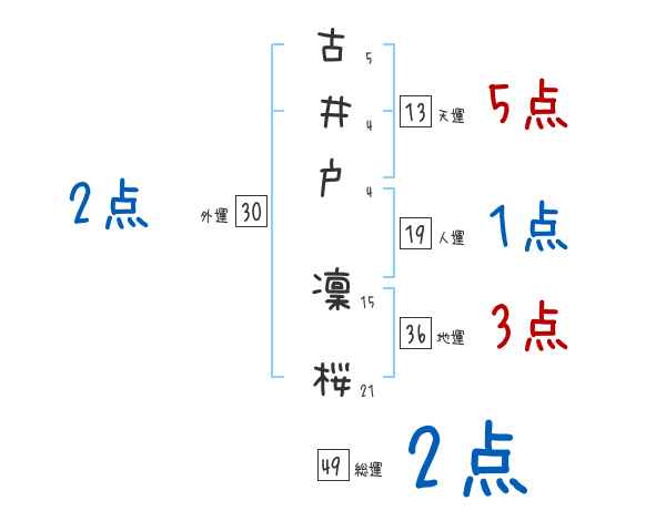 天運![]() | 古井戸凜桜さんの天運は13画の5つ星!才能に恵まれ人気がある。名声を手に入れる。円満な人生。 家系が持つ宿命的な運勢を表します。祖先から受け継いだ苗字ですので自分の力が及びません。家柄を象徴します。 |