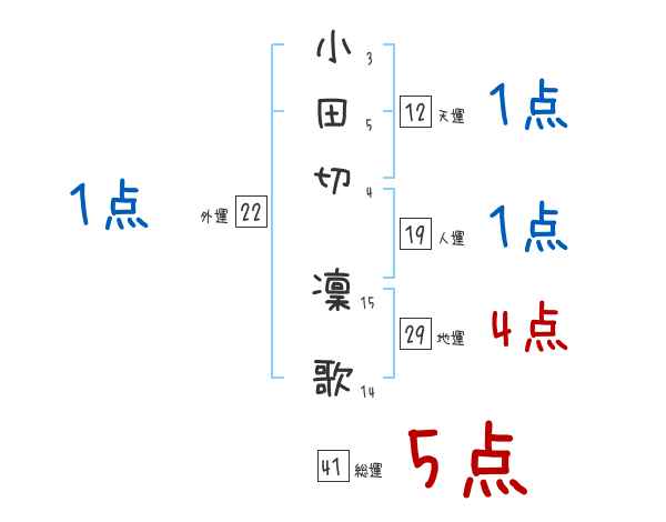 人運![]() | 小田切凜歌さんの人運は19画の1つ星!優れた才能を持ちますが、協調性が足りないことも。周りの人と協力する事を意識しましょう。 性格や才能などを表す2番目に重要な運勢です。人間関係や協調性、社会的な成功に影響します。主に20歳から50歳ぐらいまでの中年期の運勢を表します。 |