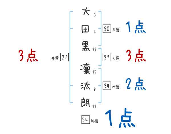 人運![]() | 大田黒凜汰朗さんの人運は27画の3つ星!頭脳明晰だが強情で摩擦が多い傾向。孤立に注意。 性格や才能などを表す2番目に重要な運勢です。人間関係や協調性、社会的な成功に影響します。主に20歳から50歳ぐらいまでの中年期の運勢を表します。 |