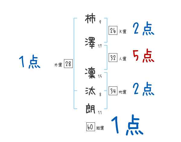 人運![]() | 柿澤凜汰朗さんの人運は32画の5つ星!柔軟性があり成功する。チャンスが多く金運が良い。 性格や才能などを表す2番目に重要な運勢です。人間関係や協調性、社会的な成功に影響します。主に20歳から50歳ぐらいまでの中年期の運勢を表します。 |