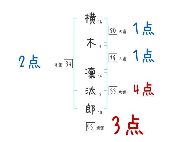 総運![]() | 横木凜汰郎さんの総運は53画の3つ星!やや見栄っ張りで虚栄心がある。散財に注意。 あなたの人生を表す1番重要な運勢です。生涯を通じて影響する総合運となり、主に50歳以降の晩年期に影響を及ぼします。 |