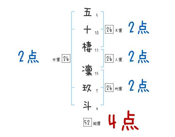 外運![]() | 五十棲凜玖斗さんの外運は26画の2つ星!波瀾万丈かも。信頼できる人を大事にしましょう。 生活面を象徴する運勢です。外部から受ける影響力を表し、結婚運、家庭運や職場、環境への順応性を表します。 |
