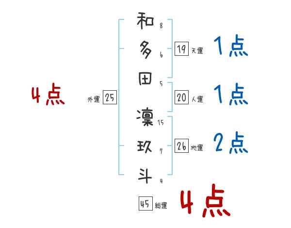 地運![]() | 和多田凜玖斗さんの地運は26画の2つ星!波瀾万丈かも。信頼できる人を大事にしましょう。 個性を表す基礎的な運勢です。性格形成や対人関係、行動力など家庭環境に影響されます。主に誕生してから20歳くらいまでの若年期の運勢を表します。 |