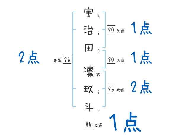 総運![]() | 宇治田凜玖斗さんの総運は46画の1つ星!迷走することが多く苦労するかも。目先のことにとらわれないように。 あなたの人生を表す1番重要な運勢です。生涯を通じて影響する総合運となり、主に50歳以降の晩年期に影響を及ぼします。 |
