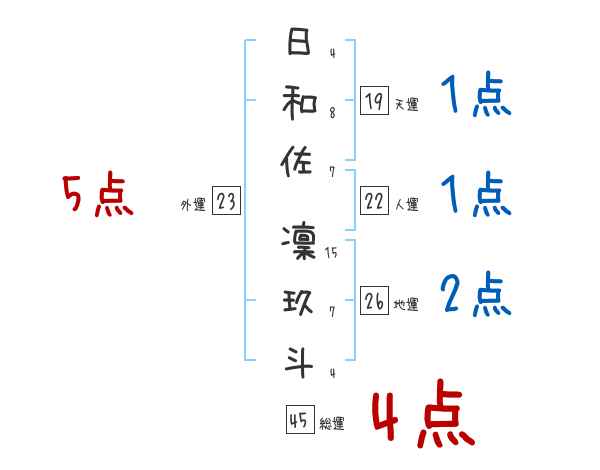 総運![]() | 日和佐凜玖斗さんの総運は45画の4つ星!もくもくと物事を進め達成する。地味な努力家。 あなたの人生を表す1番重要な運勢です。生涯を通じて影響する総合運となり、主に50歳以降の晩年期に影響を及ぼします。 |