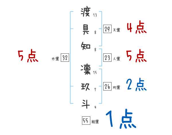 外運![]() | 渡具知凜玖斗さんの外運は32画の5つ星!柔軟性があり成功する。チャンスが多く金運が良い。 生活面を象徴する運勢です。外部から受ける影響力を表し、結婚運、家庭運や職場、環境への順応性を表します。 |