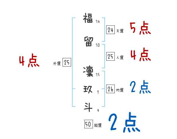 天運![]() | 福留凜玖斗さんの天運は24画の5つ星!家庭運が良く順調な人生。金運にも恵まれる。 家系が持つ宿命的な運勢を表します。祖先から受け継いだ苗字ですので自分の力が及びません。家柄を象徴します。 |