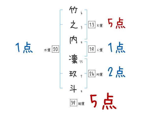 天運![]() | 竹之内凜玖斗さんの天運は13画の5つ星!才能に恵まれ人気がある。名声を手に入れる。円満な人生。 家系が持つ宿命的な運勢を表します。祖先から受け継いだ苗字ですので自分の力が及びません。家柄を象徴します。 |