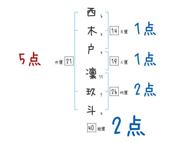 外運![]() | 西木戸凜玖斗さんの外運は21画の5つ星!統率力がある。独立し成功する。名誉を手に入れる。 生活面を象徴する運勢です。外部から受ける影響力を表し、結婚運、家庭運や職場、環境への順応性を表します。 |
