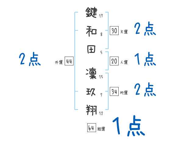 天運![]() | 鍵和田凜玖翔さんの天運は30画の2つ星!浮き沈みの激しさに注意しましょう。 家系が持つ宿命的な運勢を表します。祖先から受け継いだ苗字ですので自分の力が及びません。家柄を象徴します。 |