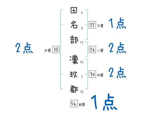 天運![]() | 田名部凜玖都さんの天運は22画の1つ星!努力することが苦手ないっぽう手先が器用。芸術性にも優れる。 家系が持つ宿命的な運勢を表します。祖先から受け継いだ苗字ですので自分の力が及びません。家柄を象徴します。 |