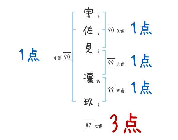 人運![]() | 宇佐見凜玖さんの人運は22画の1つ星!努力することが苦手ないっぽう手先が器用。芸術性にも優れる。 性格や才能などを表す2番目に重要な運勢です。人間関係や協調性、社会的な成功に影響します。主に20歳から50歳ぐらいまでの中年期の運勢を表します。 |