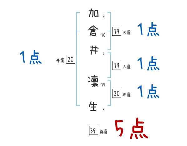 人運![]() | 加倉井凜生さんの人運は19画の1つ星!優れた才能を持ちますが、協調性が足りないことも。周りの人と協力する事を意識しましょう。 性格や才能などを表す2番目に重要な運勢です。人間関係や協調性、社会的な成功に影響します。主に20歳から50歳ぐらいまでの中年期の運勢を表します。 |