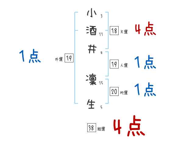 外運![]() | 小酒井凜生さんの外運は19画の1つ星!優れた才能を持ちますが、協調性が足りないことも。周りの人と協力する事を意識しましょう。 生活面を象徴する運勢です。外部から受ける影響力を表し、結婚運、家庭運や職場、環境への順応性を表します。 |