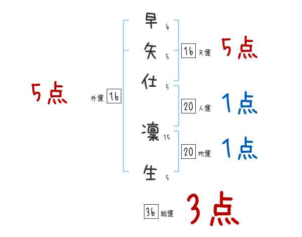 総運![]() | 早矢仕凜生さんの総運は36画の3つ星!先見性が豊かです。多少神経質で苦労することも。 あなたの人生を表す1番重要な運勢です。生涯を通じて影響する総合運となり、主に50歳以降の晩年期に影響を及ぼします。 |
