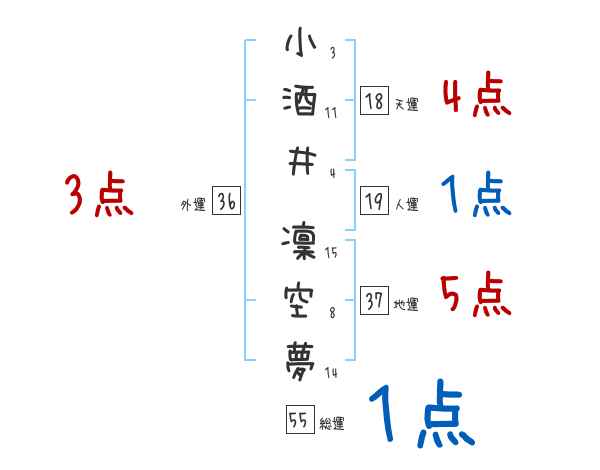 天運![]() | 小酒井凜空夢さんの天運は18画の4つ星!情熱的で剛気。忍耐力があり信頼される。 家系が持つ宿命的な運勢を表します。祖先から受け継いだ苗字ですので自分の力が及びません。家柄を象徴します。 |