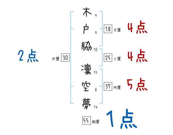 総運![]() | 木戸脇凜空夢さんの総運は55画の1つ星!欲張りな性格で軽率な行動に注意しましょう。病気に気をつけて。 あなたの人生を表す1番重要な運勢です。生涯を通じて影響する総合運となり、主に50歳以降の晩年期に影響を及ぼします。 |