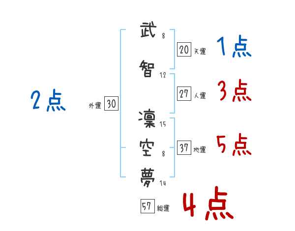総運![]() | 武智凜空夢さんの総運は57画の4つ星!向上心があり人望がある。地位を得る。 あなたの人生を表す1番重要な運勢です。生涯を通じて影響する総合運となり、主に50歳以降の晩年期に影響を及ぼします。 |