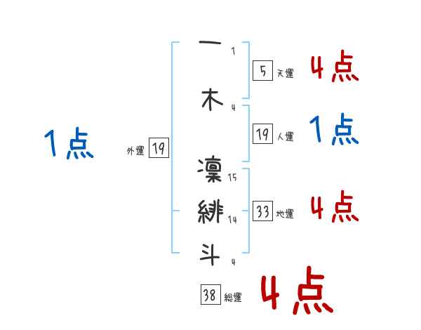 天運![]() | 一木凜緋斗さんの天運は5画の4つ星!健康で安泰。協調性に優れ、財産に恵まれる。 家系が持つ宿命的な運勢を表します。祖先から受け継いだ苗字ですので自分の力が及びません。家柄を象徴します。 |