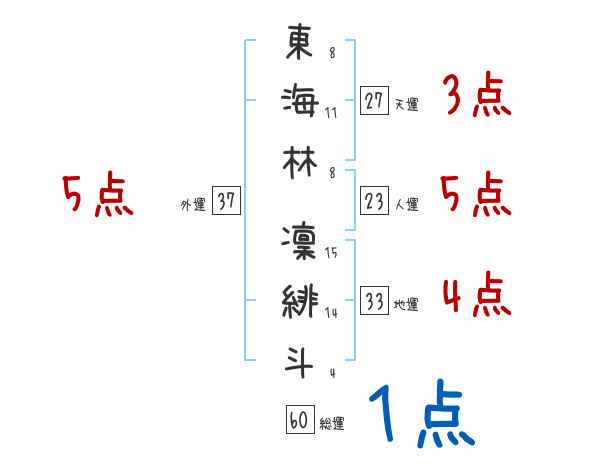 人運![]() | 東海林凜緋斗さんの人運は23画の5つ星!想像力に優れ活力がある。一代で成功し名誉を手に入れる。 性格や才能などを表す2番目に重要な運勢です。人間関係や協調性、社会的な成功に影響します。主に20歳から50歳ぐらいまでの中年期の運勢を表します。 |
