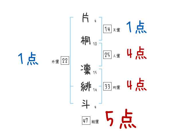 天運![]() | 片桐凜緋斗さんの天運は14画の1つ星!人に対して優しいがストレスを溜め込みがち。人間関係のトラブルを避けるよう気をつけましょう。 家系が持つ宿命的な運勢を表します。祖先から受け継いだ苗字ですので自分の力が及びません。家柄を象徴します。 |