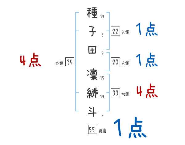 外運![]() | 種子田凜緋斗さんの外運は35画の4つ星!温厚な性格で感受性が高い。穏和な性格で人望が厚い。 生活面を象徴する運勢です。外部から受ける影響力を表し、結婚運、家庭運や職場、環境への順応性を表します。 |