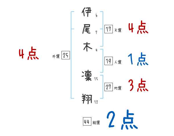 総運![]() | 伊尾木凜翔さんの総運は44画の2つ星!誠実で慎重な性格。物事を考えすぎないように注意しましょう。 あなたの人生を表す1番重要な運勢です。生涯を通じて影響する総合運となり、主に50歳以降の晩年期に影響を及ぼします。 |