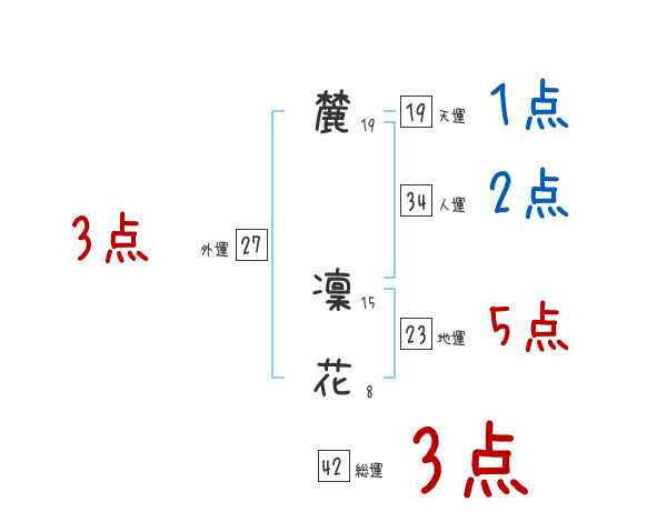 天運![]() | 麓凜花さんの天運は19画の1つ星!優れた才能を持ちますが、協調性が足りないことも。周りの人と協力する事を意識しましょう。 家系が持つ宿命的な運勢を表します。祖先から受け継いだ苗字ですので自分の力が及びません。家柄を象徴します。 |