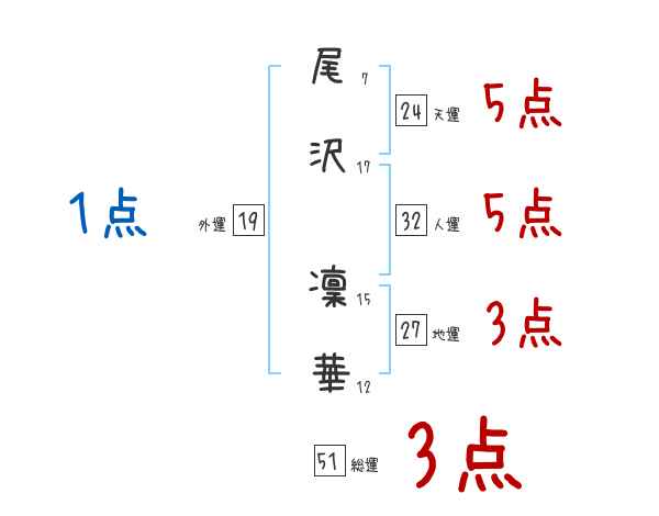 人運![]() | 尾沢凜華さんの人運は32画の5つ星!柔軟性があり成功する。チャンスが多く金運が良い。 性格や才能などを表す2番目に重要な運勢です。人間関係や協調性、社会的な成功に影響します。主に20歳から50歳ぐらいまでの中年期の運勢を表します。 |