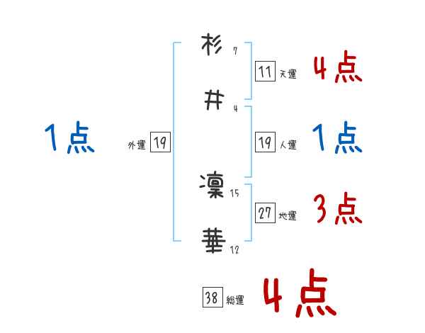 天運![]() | 杉井凜華さんの天運は11画の4つ星!着実に富や地位を得る幸運な人生。 家系が持つ宿命的な運勢を表します。祖先から受け継いだ苗字ですので自分の力が及びません。家柄を象徴します。 |