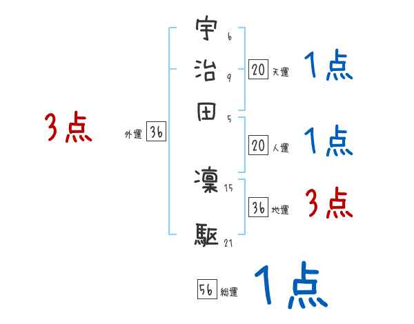 外運![]() | 宇治田凜駆さんの外運は36画の3つ星!先見性が豊かです。多少神経質で苦労することも。 生活面を象徴する運勢です。外部から受ける影響力を表し、結婚運、家庭運や職場、環境への順応性を表します。 |