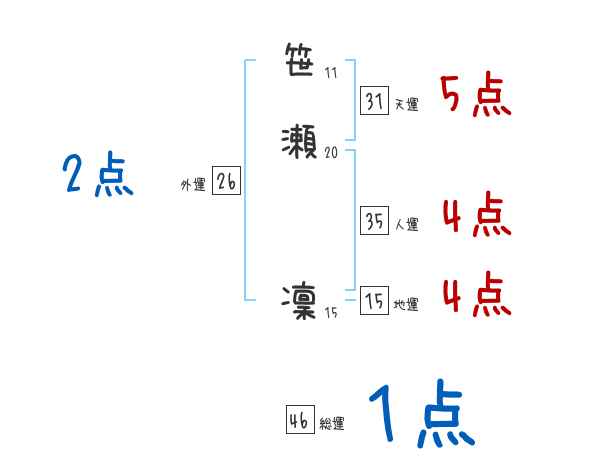 人運![]() | 笹瀬凜さんの人運は35画の4つ星!温厚な性格で感受性が高い。穏和な性格で人望が厚い。 性格や才能などを表す2番目に重要な運勢です。人間関係や協調性、社会的な成功に影響します。主に20歳から50歳ぐらいまでの中年期の運勢を表します。 |