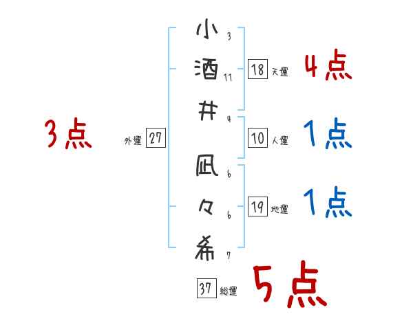外運![]() | 小酒井凪々希さんの外運は27画の3つ星!頭脳明晰だが強情で摩擦が多い傾向。孤立に注意。 生活面を象徴する運勢です。外部から受ける影響力を表し、結婚運、家庭運や職場、環境への順応性を表します。 |
