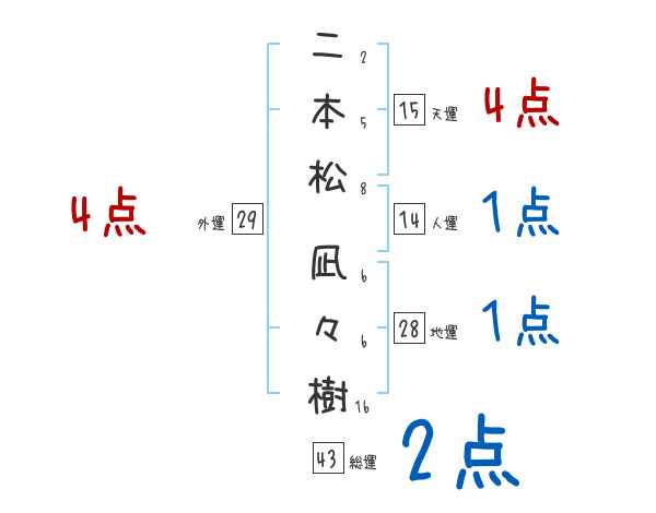総運![]() | 二本松凪々樹さんの総運は43画の2つ星!頑固な性格で独立心が強いかも。やや非現実的で浪費に注意しましょう。 あなたの人生を表す1番重要な運勢です。生涯を通じて影響する総合運となり、主に50歳以降の晩年期に影響を及ぼします。 |