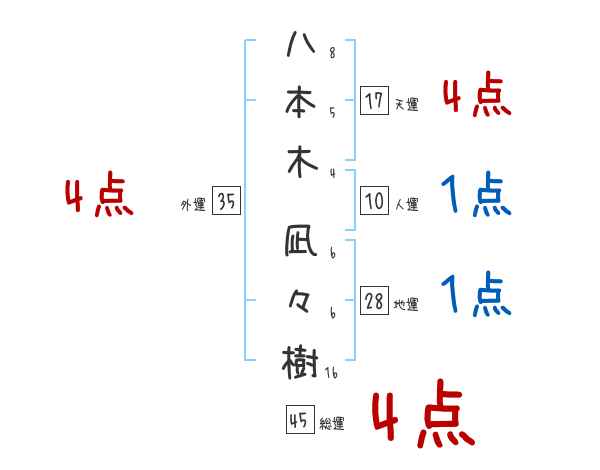 外運![]() | 八本木凪々樹さんの外運は35画の4つ星!温厚な性格で感受性が高い。穏和な性格で人望が厚い。 生活面を象徴する運勢です。外部から受ける影響力を表し、結婚運、家庭運や職場、環境への順応性を表します。 |