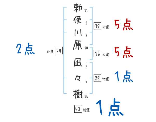 天運![]() | 勅使川原凪々樹さんの天運は32画の5つ星!柔軟性があり成功する。チャンスが多く金運が良い。 家系が持つ宿命的な運勢を表します。祖先から受け継いだ苗字ですので自分の力が及びません。家柄を象徴します。 |