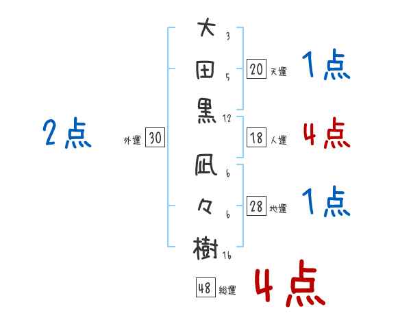 外運![]() | 大田黒凪々樹さんの外運は30画の2つ星!浮き沈みの激しさに注意しましょう。 生活面を象徴する運勢です。外部から受ける影響力を表し、結婚運、家庭運や職場、環境への順応性を表します。 |
