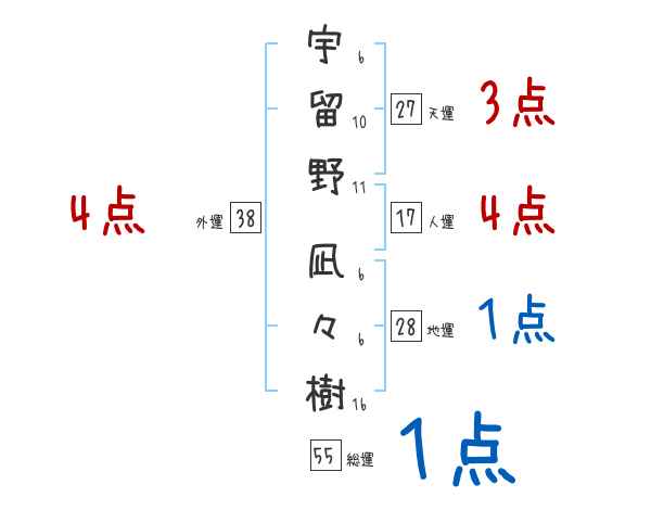 外運![]() | 宇留野凪々樹さんの外運は38画の4つ星!温厚な性格で技術的な才能を発揮する。職人的な仕事に向いている。 生活面を象徴する運勢です。外部から受ける影響力を表し、結婚運、家庭運や職場、環境への順応性を表します。 |